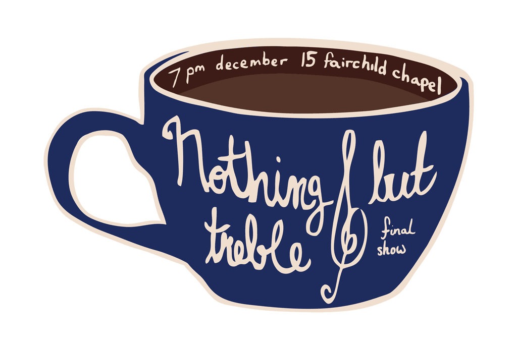 My a capella group, Nothing But Treble, chose a tea party theme for our end-of-semester concert. All I knew from the moment we picked the theme was that the poster was going to involve a big blue teacup, though the teacup I initially pictured was very different from the one shown here. I ended up modeling the cup on those found at the Slow Train Cafe, a coffee shop in Oberlin.
