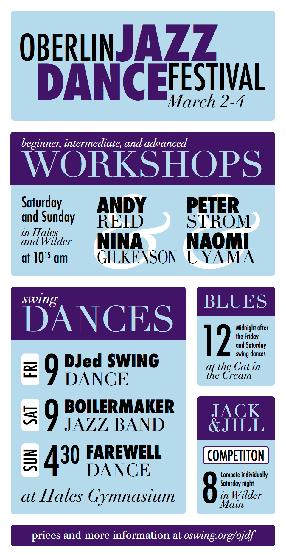 This poster required a lot of information, including enough of a schedule that people could come to the event without finding any more information about it. People were likely to be interested in a variety of different parts of the event, and the purple headers are designed to draw attention to each of those aspects. It was also important to make it relatively clear that the event was focused on swing dancing, rather than all kinds of jazz dance.