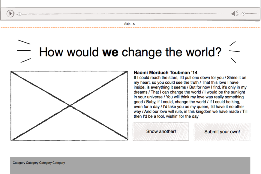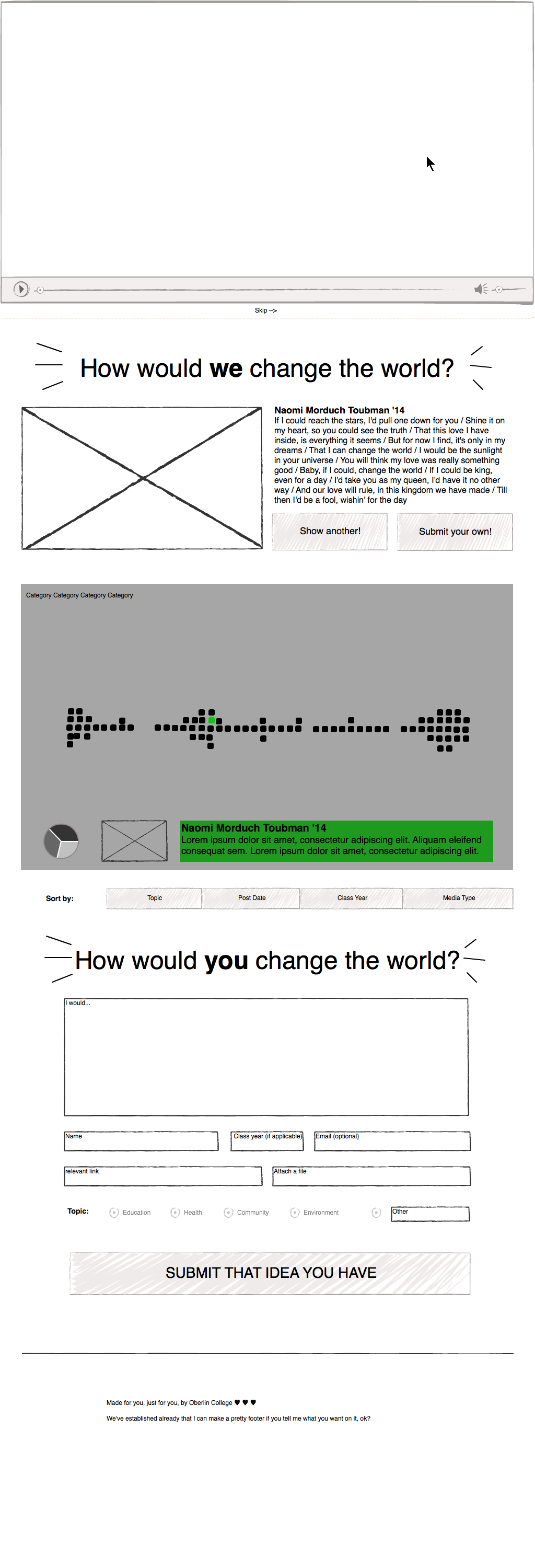 I made a wireframe for a page that would hold a campaign to get people to submit how they would change the world. It features a video at the top, then some detailed submissions, a few ways of viewing the spread of all submissions, and a simple submission form.