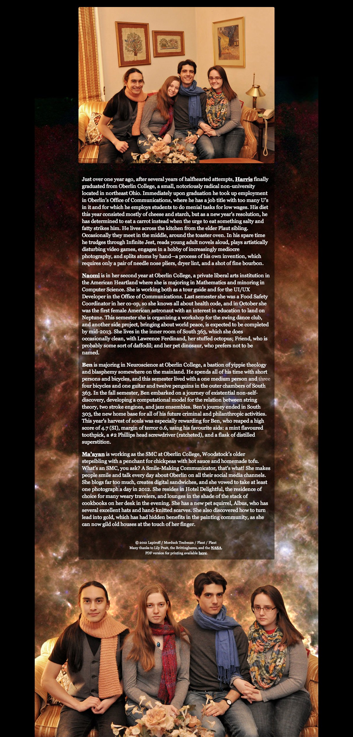 At the beginning of 2012, I asked a few friends to work with me to make a family update card. I did all of the design and convincing everyone to actually write their paragraphs. You can read more about the process in my friend’s blog post.