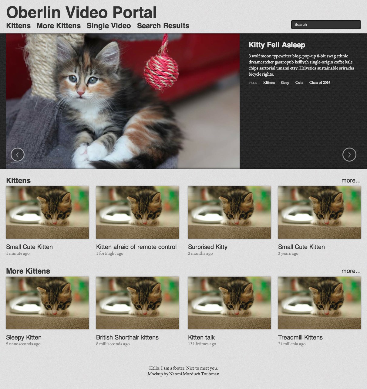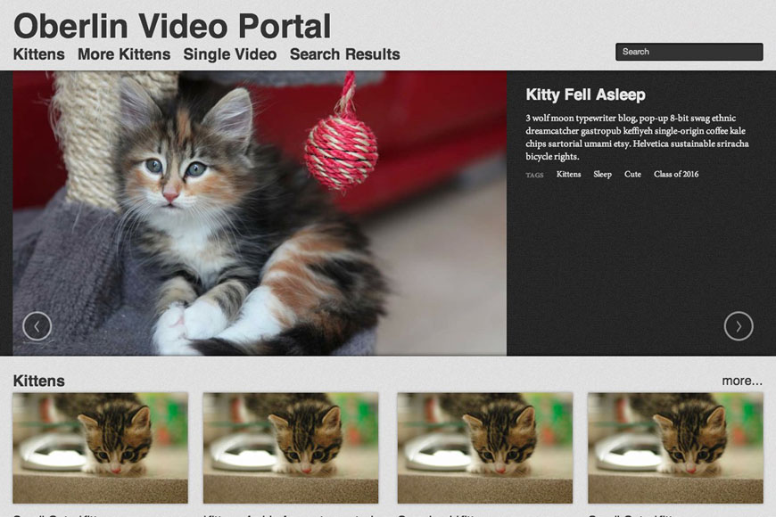 In the summer of 2012 I made a mockup of what will eventually be the Oberlin Video Portal. It was my first mobile-first design, and is currently stocked with images from placekitten and text from Hipster Ipsum. There are three pages to the mockup, accessible from header (“Search Results” and “Single Video”). Some of the links might also go to real Youtube videos. Maybe.